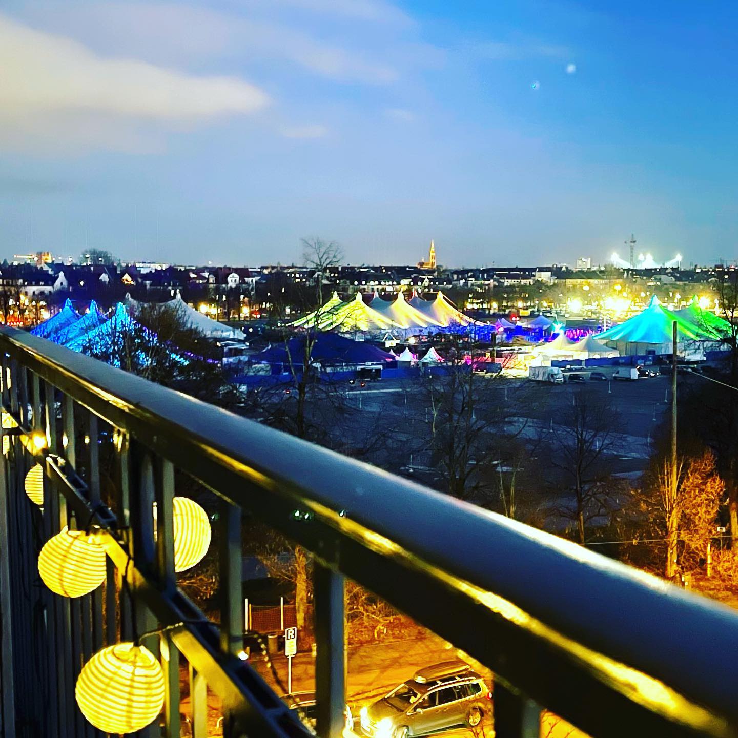 Von der Dachterrasse des Hotels hat man einen spektakulären Blick über die Theresienwiese, die je nach Jahreszeit ganz unterschiedliche Ausblicke bietet.