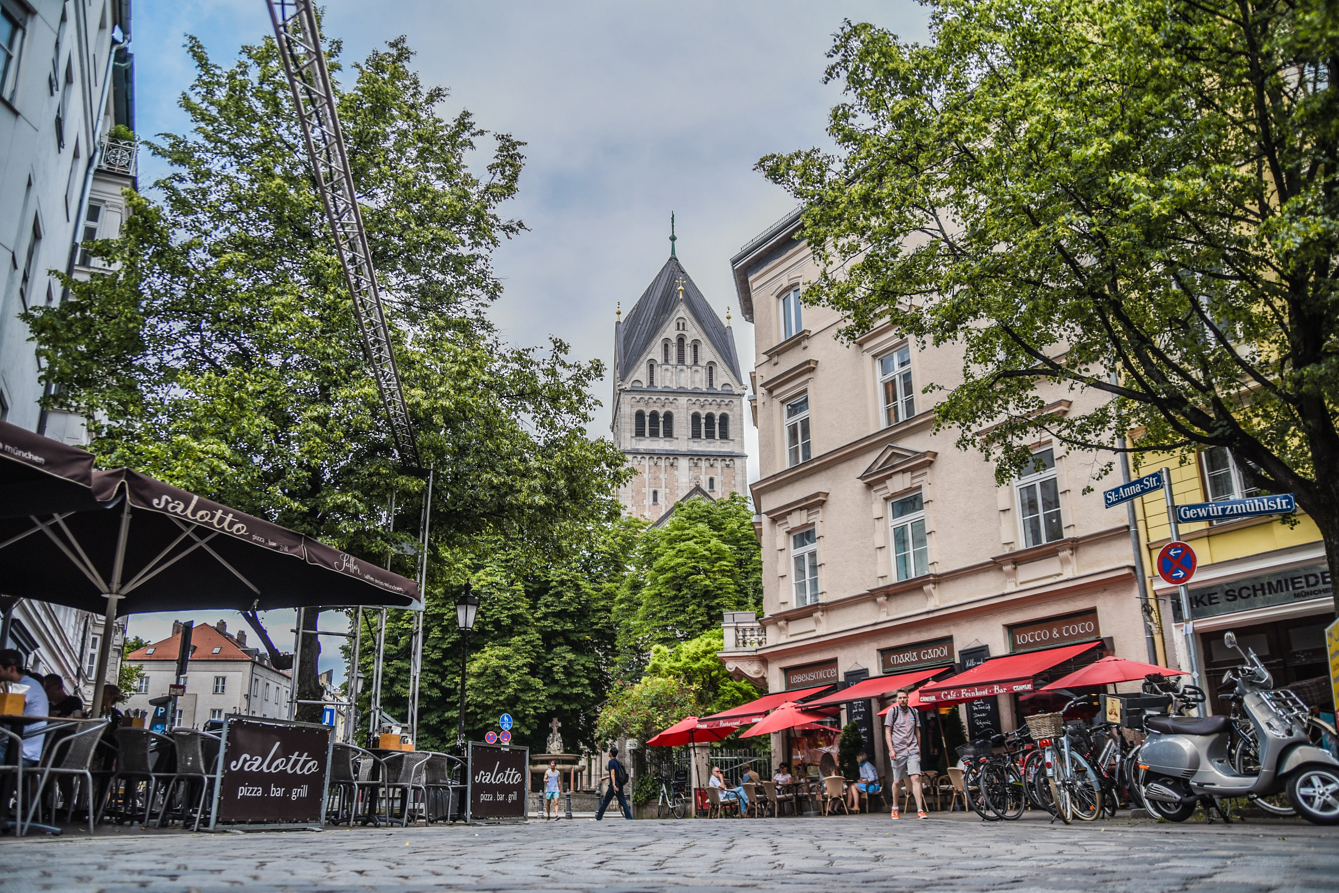 Der St.-Anna-Platz liegt im charmanten Stadtteil Lehel. Der idyllische Platz ist bekannt für sein malerisches Ambiente und seine historische Bedeutung durch das St. Anna Kloster. Die neue St. Anna Kirche im neuromanischen Stil prägt dabei den Platz und lädt zu einem Besuch ein. Der Platz selbst bietet mit seinen schattenspendenden Bäumen und Bänken eine perfekte Kulisse zum Verweilen und Entspannen. Die zahlreichen Restaurants und Cafés rund um den Platz sorgen für ein fast mediterranes Flair. Hier befindet sich außerdem einer unserer kulinarischen Partner, das Restaurant Gandl, das mittags mit feiner italienischer und abends mit gehobener französischer Küche begeistert. Die sonnigen Terrassen laden zum Verweilen und Genießen ein.