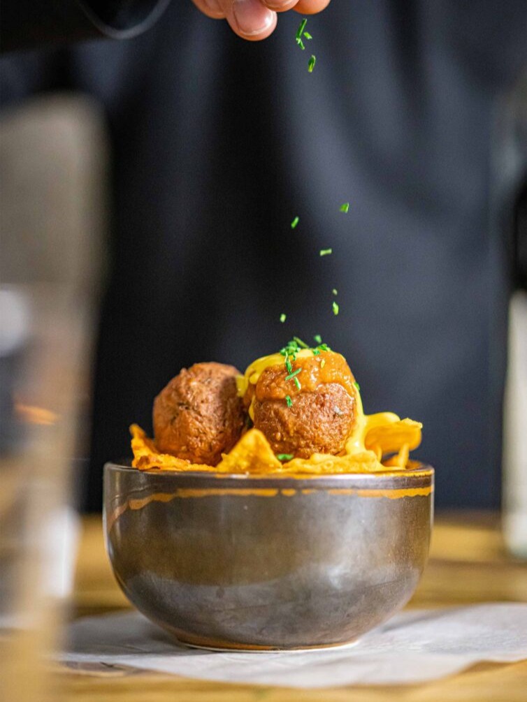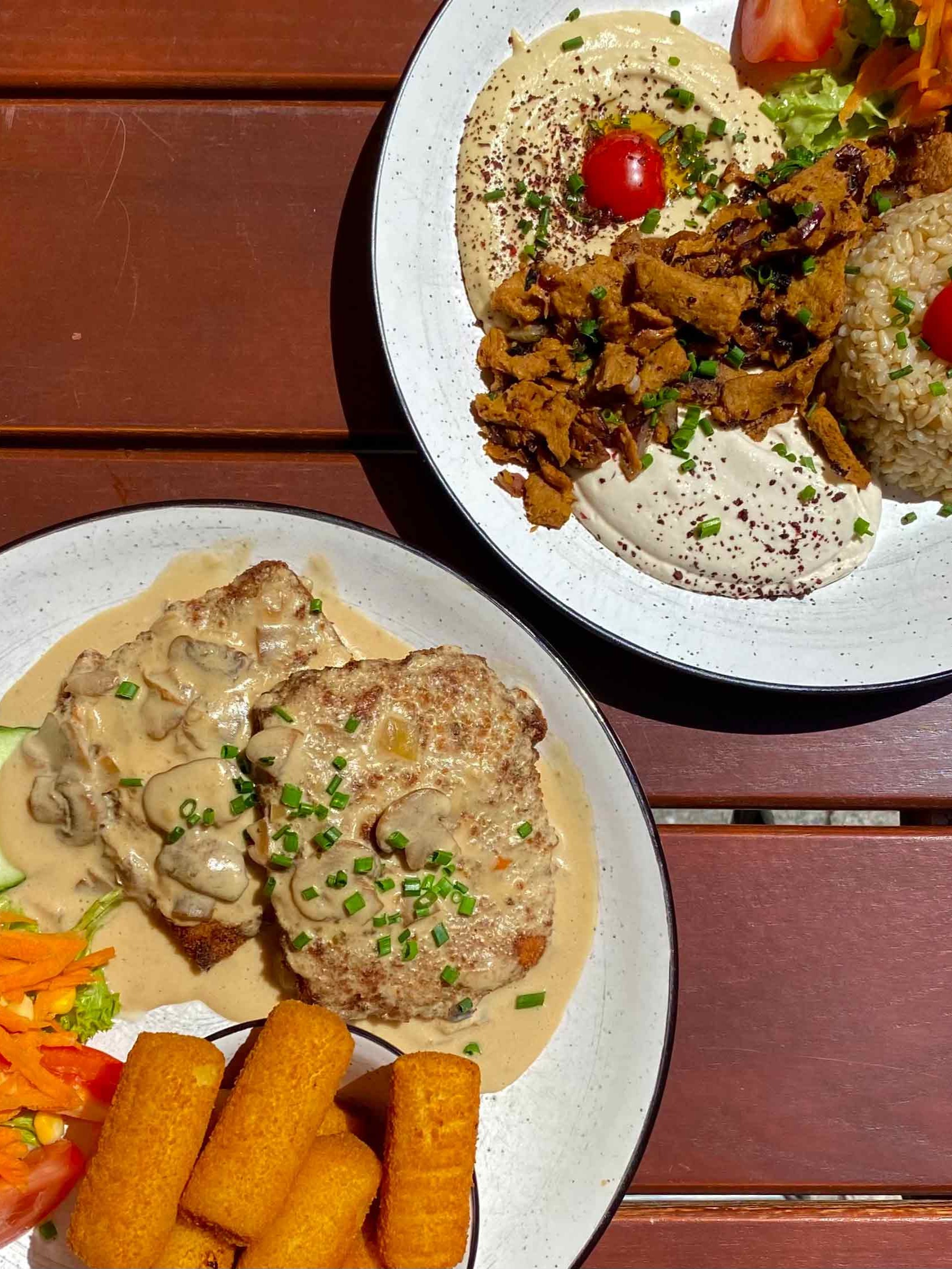 Hier stehen vegane Gerichte wie das „Anti-Jäger-Schnitzel“ mit Pilzrahmsoße, Flammkuchen, Pasta-Ragout mit hausgemachter Bolognese oder vegane Tortilla Meatballs auf der Speisekarte.